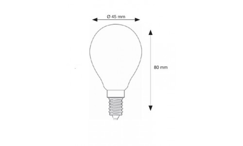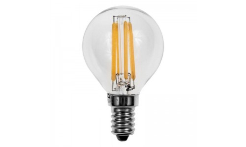 Bombilla LED Esferica Clara E14 4W 2700ºK ESFE144W27F FILAMENTO. Ahorra más de un 60% respecto de las luminarias de bajo consumo y con un 10% más de luminosidad. Encendido instantáneo, no parpadea, no hace ruido.  Son ecológicas porque no usan materiales contaminantes y reducen las emisiones de CO2 a la atmósfera. La solución ideal para lugares donde la luminaria está muchas horas encendida como parkings, ascensores, oficinas, tiendas, hospitales, etc. Para apliques, luminarias empotrar o de pie y cualquier aparato donde por las dimensiones de la lámpara se pueda instalar.