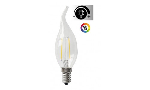 Bombilla LED vela lisa Clara Flama E14 4W 2700ºK CRI90 Regulable VLCE144W27FFLAMACRI90D FILAMENTO, de alta potencia lumínica con un CRI mayor de 80, un factor de potencia del 0,92 y una duración de más 50.000 horas.