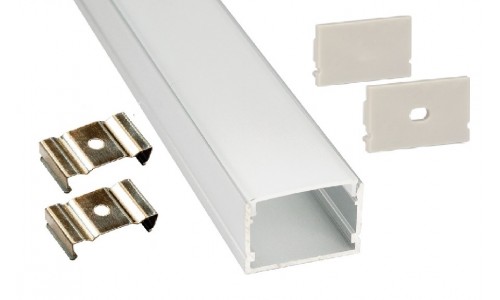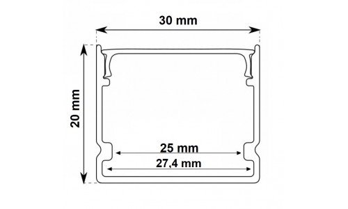 Perfil de aluminio de superficie de 30x20mm. Barra de 2 metros. Para tira LED El precio incluye: Tira perfil, 2 tapas finales, 2 grapas fijación y difusor.