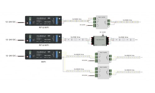 Si quieres controlar 4 zonas de forma independiente, necesitas 4 controladores y un mando a distancia. La instalación y configuración es muy sencilla, para asignar una zona a un controlador solo tienes de conectar la tira al controlador, conectar el adaptador de corriente, y pulsar en el mando a distancia el botón ON de la zona que se le quiere asignar durante tres segundos. La tira luego empieza a parpadear para indicar que se ha programado con éxito.