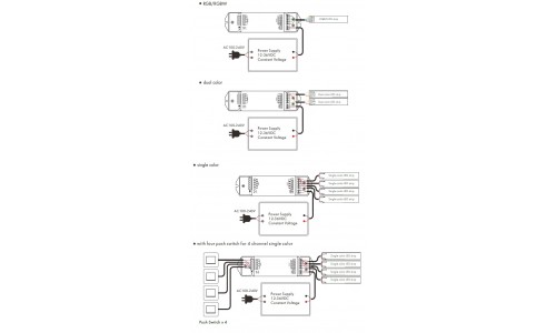 Si quieres controlar 4 zonas de forma independiente, necesitas 4 controladores y un mando a distancia. La instalación y configuración es muy sencilla, para asignar una zona a un controlador solo tienes de conectar la tira al controlador, conectar el adaptador de corriente, y pulsar en el mando a distancia el botón ON de la zona que se le quiere asignar durante tres segundos. La tira luego empieza a parpadear para indicar que se ha programado con éxito.