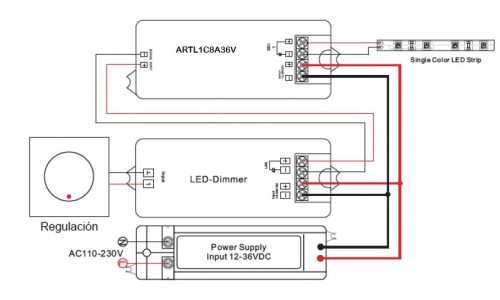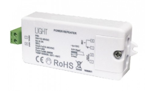 Amplificador Señal par Tira LED 1 canal 8A 12V-36VDC para voltaje constante para interior ARTL1C8A36V. Necesario para instalación de tiras LED que superen los 8 metros de longitud o donde la señal necesita más potencia.