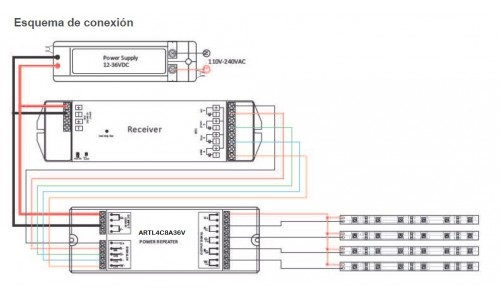 Amplificador Señal par Tira LED RGBW 4 canales 8A 12V-36VDC para voltaje constante para interior ARTL4C8A36V. Necesario para instalación de tiras LED RGBW que superen los 8 metros de longitud o donde la señal necesita más potencia.