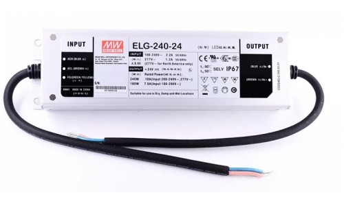 Fuentes de alimentación o Driver 240W 24VDC MEAN WELL estanca FA24240MWIP, están fabricadas especialmente para alimentar sistemas de Led. Gracias a su total estanquidad, con un grado de protección IP67, pueden utilizarse en el exterior, con un rango de temperaturas de -40ºC~+90ºC. Por su electrónica interna estas fuentes están protegidas contra cortocircuitos y sobrecargas. Otra característica es su amplio rango de tensión de entrada, 100-305Vca, esto permitirá que las posibles fluctuaciones en la red eléctrica proteja su instalación.