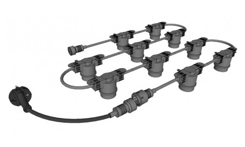 Guirnalda para 10 bombillas E27, separación 1 metro entre portalámparas, protección IP44.