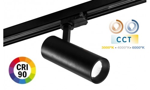 Focos carril Trifásico LED COB MD16 20W Negro, CCT Seleccionable CRI90 FCTCOBMD1620CCTN con chip BRIDGELUX con cambio de color (3000º, 4000ºK ó 6000ºK) para carril trifásico 4 vías están especialmente diseñados para cubrir las necesidades de un usuario exigente que precisa de luminarias que realcen elementos decorativos concretos, fomentando la creación de múltiples ambientes. Todos los modelos requieren de raíles para la instalación.