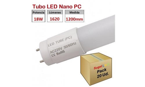 Tubo LED T8 1200mm Nano PC Eco 18W, conexión 1 lado, Caja de 20 ud x 4,50€/ud.