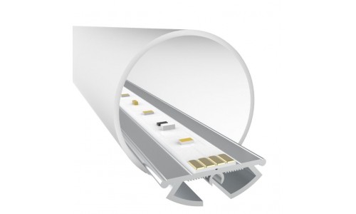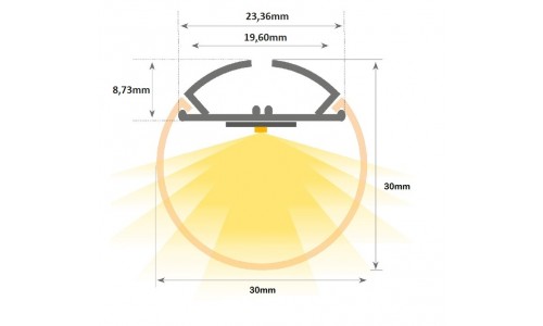 Perfil Aluminio anodizado con difusor Redondo ECO 30mm. para tiras LED, barra 2 Metros -completo- PR30E2M. En aluminio de alta pureza y anodizado en plata. No permite alojar los drivers en su interior. Difusor blanco opal de gran tamaño que ofrece una gran proyección lumínica.