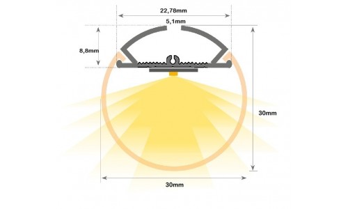 Perfil Aluminio anodizado con difusor Redondo PRO 30mm. para tiras LED, barra 2 Metros -completo-