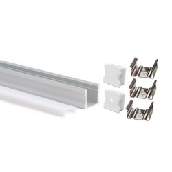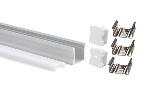 Perfil de aluminio de superficie ECO Blanco 17x14,5mm. para tiras LED, barra de 2 Metros - completo-. El precio incluye: Tira perfil, 1 tapas finales, 1 tapa final con salida cable, 3 grapas fijación y difusor.