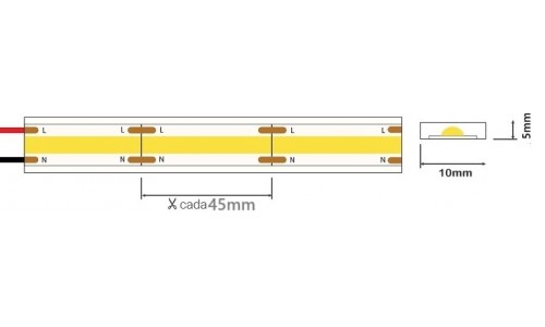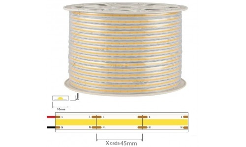 Tira LED 230V monocolor 15W/mt COB IP67 10x5mm corte cada 45mm, Bobina 50mts TLDCOB15B50. Tira LED monocolor que cuenta con protección IP67 y utiliza LEDs COB calidad Profesional con 15W de consumo por metro y CRI +90 que garantiza una perfecta de los colores. Con cinta adhesiva no necesita Fuente alimentación ni rectificador. Se puede regular la intensidad luminosa por Triac. Conexión por un extremo sin caída de tensión. Este tipo de tira LED flexible de alta tensión se conecta directamente a la red eléctrica de 230V AC. Del mismo modo, para completar el montaje y la protección IP67, se deben incluir accesorios necesarios. A la hora de utilizar esta tira de LED, hay que tener en cuenta su intensidad lumínica, por lo que tendremos que poner un objeto cercano en el que proyecte la luz. Si su fin es como señalización, (delimitar pasillo, resaltar zonas de paso,…) no es necesario buscar un objeto donde proyectar la luz. Ideal para iluminación de fachada, techos, residencias, teatros, zonas exteriores, vitrinas, luz comercial, escaparates. También son utilizadas para balizamiento de escaleras y pasillos.