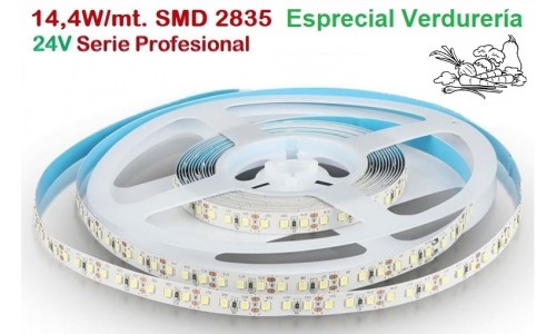 Tira LED Flexible 24V 14W/mt 120 Led/mt SMD 2835 IP20 Especial Frutería, Serie Profesional, venta por metros de 1 a 25mts a medida de su necesidad. Se suminsitra en tirada continua hasta 25mts. TLF142835FRUP24M 14W/mt 120 Led/m. Tira LED especial para iluminación de Frutas y verduras.
