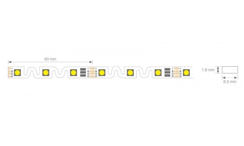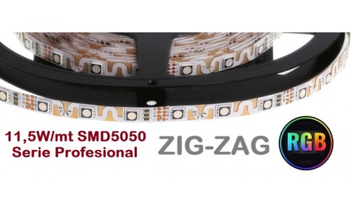 Tira LED 5 mts Flexible ZIG-ZAG 60W 240 Led SMD 5050 IP20 RGB, Serie Profesional TLFZ60RGBP 11,5W/mt 48 Led/m, Cinta térmica disipadira incluida. Tira led RGB, cambio de colores. Tira led por excelencia para decoraciones, y para ofrecer en una misma instalación diversos tipos de ambientes. (Luz en movimiento). Es necesario un controlador (mando a distancia) para poder realizar los cambios de colores, programándolos o manualmente. Tira LED flexibles serie Professional son de máxima calidad (High Quality) y se presentan con configuraciones de distintas medidas y prestaciones. Modelos estándar o estancos con distintos tipos de leds SMD como unidad de luz principal, en tipo 3528 y 5050, 3014 y 5630. Su flexibilidad y la dotación de accesorios permiten su aplicación en multitud de diseños de iluminación decorativa de bajo consumo con un gran ahorro de energía El formato de nuestras tiras de LED, viene en rollos de LED de 5 metros pudiéndose cortar en múltiplos de 5 cm, de ese modo se consigue acoplarlo en cualquier proyecto a medida. Las tiras de LED autoadhesiva, y presente diferentes grados de protección.