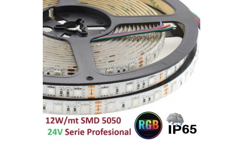 Tira LED Flexible 24V 12W/mt 60 Led/mt SMD 5050 IP65 RGB Serie Profesional, Venta por metros de 1 a 20mts a medida de su necesidad. Se suministra en tirada continua hasta 20mts TLF125050RGBP24IP65M. Tira LED flexibles serie Profesional son de máxima calidad (High Quality) y se presentan con configuraciones de distintas medidas y prestaciones. Modelos estándar o estancos con distintos tipos de leds SMD como unidad de luz principal, en tipo 3528 y 5050, 2835, 3014 y 5630. Su flexibilidad y la dotación de accesorios permiten su aplicación en multitud de diseños de iluminación decorativa de bajo consumo con un gran ahorro de energía El formato de nuestras tiras de LED, viene en rollos de LED de 5 metros pudiéndose cortar en múltiplos de 5 cm, de ese modo se consigue acoplarlo en cualquier proyecto a medida. Las tiras de LED autoadhesiva, y presente diferentes grados de protección. A la hora de utilizar esta tira de LED, hay que tener en cuenta su intensidad lumínica, por lo que tendremos que poner un objeto cercano en el que proyecte la luz. Si su fin es como señalización, (delimitar pasillo, resaltar zonas de paso,…) no es necesario buscar un objeto donde proyectar la luz.
