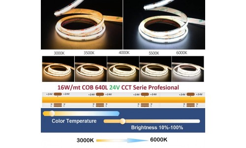 Tira LED Flexible 24V 16W/mt COB IP20 CCT 3000ºK a 6000ºK, Serie Profesional, venta por metros