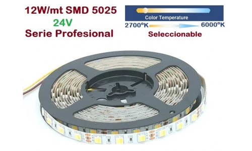 Tira LED Flexible 24V 12W/mt 60 Led/mt SMD 5025 IP20 CCT 2700ºK a 6000ºK Serie Profesional, Rollo 5 mts TLF125025CCTP24R5. Tira LED flexibles serie Profesional son de máxima calidad (High Quality) y se presentan con configuraciones de distintas medidas y prestaciones. Modelos estándar o estancos con distintos tipos de leds SMD como unidad de luz principal, en tipo 3528 y 5050, 2835, 3014 y 5630. Su flexibilidad y la dotación de accesorios permiten su aplicación en multitud de diseños de iluminación decorativa de bajo consumo con un gran ahorro de energía El formato de nuestras tiras de LED, viene en rollos de LED de 5 metros pudiéndose cortar en múltiplos de 5 cm, de ese modo se consigue acoplarlo en cualquier proyecto a medida. Las tiras de LED autoadhesiva, y presente diferentes grados de protección. A la hora de utilizar esta tira de LED, hay que tener en cuenta su intensidad lumínica, por lo que tendremos que poner un objeto cercano en el que proyecte la luz. Si su fin es como señalización, (delimitar pasillo, resaltar zonas de paso,…) no es necesario buscar un objeto donde proyectar la luz.