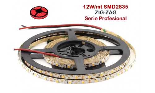 Tira LED 5 mts Flexible ZIG-ZAG 60W 300 Led SMD 2835 IP54 Rojo Serie Profesional TLFZ602835ROPROIP 12W/mt 60 Led/m. Tira LED flexibles serie Profesional son de máxima calidad (High Quality) y se presentan con configuraciones de distintas medidas y prestaciones. Modelos estándar o estancos con distintos tipos de leds SMD como unidad de luz principal, en tipo 3528 y 5050, 2835, 3014 y 5630. Su flexibilidad y la dotación de accesorios permiten su aplicación en multitud de diseños de iluminación decorativa de bajo consumo con un gran ahorro de energía El formato de nuestras tiras de LED, viene en rollos de LED de 5 metros pudiéndose cortar en múltiplos de 5 cm, de ese modo se consigue acoplarlo en cualquier proyecto a medida. Las tiras de LED autoadhesiva, y presente diferentes grados de protección. A la hora de utilizar esta tira de LED, hay que tener en cuenta su intensidad lumínica, por lo que tendremos que poner un objeto cercano en el que proyecte la luz. Si su fin es como señalización, (delimitar pasillo, resaltar zonas de paso,…) no es necesario buscar un objeto donde proyectar la luz.