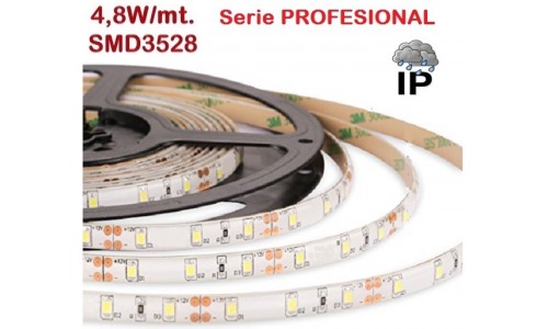 Tira LED 5 mts Flexible 24W 300 Led SMD 3528 IP65 Blanco Frío, serie Profesional TLF24CWIP65PRO 4,8W/mt 60 Led/m. Tira LED flexibles serie Professional son de máxima calidad (High Quality) y se presentan con configuraciones de distintas medidas y prestaciones. Su flexibilidad y la dotación de accesorios permiten su aplicación en multitud de diseños de iluminación decorativa de bajo consumo con un gran ahorro de energía. Las tiras de LED es autoadhesiva y presente diferentes grados de protección. A la hora de utilizar esta tira de LED, hay que tener en cuenta su intensidad lumínica, por lo que tendremos que poner un objeto cercano en el que proyecte la luz. Si su fin es como señalización, (delimitar pasillo, resaltar zonas de paso,…) no es necesario buscar un objeto donde proyectar la luz.