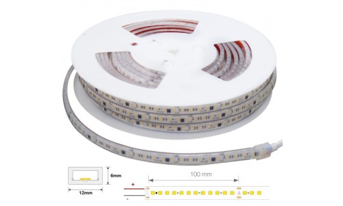 Tira LED 230V monocolor 15W/mt 120L/mt. SMD 2835 IP67 12x6mm corte cada 100mm, rollo 5mts. TLD283515R5. Tira LED monocolor que cuenta con protección IP67 y utiliza LEDs SMD2835 con 15W de consumo por metro. Este tipo de tira LED flexible de alta tensión se conecta directamente a la red eléctrica de 230V AC. Del mismo modo, para completar el montaje y la protección IP67, se deben incluir accesorios necesarios. A la hora de utilizar esta tira de LED, hay que tener en cuenta su intensidad lumínica, por lo que tendremos que poner un objeto cercano en el que proyecte la luz. Si su fin es como señalización, (delimitar pasillo, resaltar zonas de paso,…) no es necesario buscar un objeto donde proyectar la luz.Ideal para iluminación de fachada, techos, residencias, teatros, zonas exteriores, vitrinas, luz comercial, escaparates. También son utilizadas para balizamiento de escaleras y pasillos.