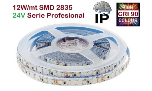 Tira LED 5 mts Flexible 24V 60W 600 Led SMD 2835 IP65, Serie Profesional TLF602835P24IP65 12W/mt 120 Led/m. Tira LED flexibles serie Professional son de máxima calidad (High Quality), con IRC >90 y se presentan con configuraciones de distintas medidas y prestaciones. Este tipo de tira de LED trabaja con fuente de alimentación de 24V en corriente continua. Su flexibilidad y la dotación de accesorios permiten su aplicación en multitud de diseños de iluminación decorativa de bajo consumo con un gran ahorro de energía. Las tiras de LED es autoadhesiva y presente diferentes grados de protección. A la hora de utilizar esta tira de LED, hay que tener en cuenta su intensidad lumínica, por lo que tendremos que poner un objeto cercano en el que proyecte la luz. Si su fin es como señalización, (delimitar pasillo, resaltar zonas de paso,…) no es necesario buscar un objeto donde proyectar la luz.