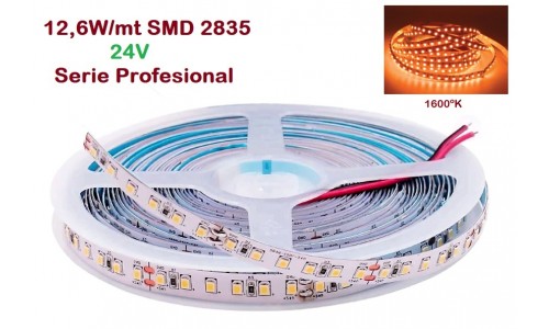 Tira LED Flexible 24V 12,6W/mt 120 Led/mt SMD 2835 IP20 1800ºK Serie Profesional, Venta por metros de 1 a 25mts a medida de su necesidad. Se suministra en tirada continua hasta 25mts TLF12283518P24M. Tira LED flexibles serie Profesional son de máxima calidad (High Quality) y se presentan con configuraciones de distintas medidas y prestaciones. Modelos estándar o estancos con distintos tipos de leds SMD como unidad de luz principal, en tipo 3528 y 5050, 2835, 3014 y 5630. Su flexibilidad y la dotación de accesorios permiten su aplicación en multitud de diseños de iluminación decorativa de bajo consumo con un gran ahorro de energía El formato de nuestras tiras de LED, viene en rollos de LED de 5 metros pudiéndose cortar en múltiplos de 5 cm, de ese modo se consigue acoplarlo en cualquier proyecto a medida. Las tiras de LED autoadhesiva, y presente diferentes grados de protección. A la hora de utilizar esta tira de LED, hay que tener en cuenta su intensidad lumínica, por lo que tendremos que poner un objeto cercano en el que proyecte la luz. Si su fin es como señalización, (delimitar pasillo, resaltar zonas de paso,…) no es necesario buscar un objeto donde proyectar la luz.