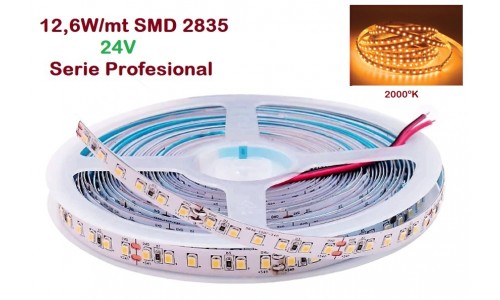 Tira LED Flexible 24V 12,6W/mt 120 Led/mt SMD 2835 IP20 2200ºK Serie Profesional, Venta por metros de 1 a 25mts a medida de su necesidad. Se suministra en tirada continua hasta 25mts TLF12283522P24M. Tira LED flexibles serie Profesional son de máxima calidad (High Quality) y se presentan con configuraciones de distintas medidas y prestaciones. Modelos estándar o estancos con distintos tipos de leds SMD como unidad de luz principal, en tipo 3528 y 5050, 2835, 3014 y 5630. Su flexibilidad y la dotación de accesorios permiten su aplicación en multitud de diseños de iluminación decorativa de bajo consumo con un gran ahorro de energía El formato de nuestras tiras de LED, viene en rollos de LED de 5 metros pudiéndose cortar en múltiplos de 5 cm, de ese modo se consigue acoplarlo en cualquier proyecto a medida. Las tiras de LED autoadhesiva, y presente diferentes grados de protección. A la hora de utilizar esta tira de LED, hay que tener en cuenta su intensidad lumínica, por lo que tendremos que poner un objeto cercano en el que proyecte la luz. Si su fin es como señalización, (delimitar pasillo, resaltar zonas de paso,…) no es necesario buscar un objeto donde proyectar la luz.