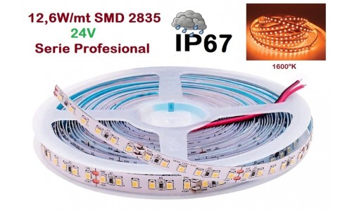 Tira LED Flexible 24V 12,6W/mt 120 Led/mt SMD 2835 IP67 1600ºK Serie Profesional, Venta por metros de 1 a 25mts a medida de su necesidad. Se suministra en tirada continua hasta 25mts TLF12283516P24IP67M. Tira LED flexibles serie Profesional son de máxima calidad (High Quality) y se presentan con configuraciones de distintas medidas y prestaciones. Modelos estándar o estancos con distintos tipos de leds SMD como unidad de luz principal, en tipo 3528 y 5050, 2835, 3014 y 5630. Su flexibilidad y la dotación de accesorios permiten su aplicación en multitud de diseños de iluminación decorativa de bajo consumo con un gran ahorro de energía El formato de nuestras tiras de LED, viene en rollos de LED de 5 metros pudiéndose cortar en múltiplos de 5 cm, de ese modo se consigue acoplarlo en cualquier proyecto a medida. Las tiras de LED autoadhesiva, y presente diferentes grados de protección. A la hora de utilizar esta tira de LED, hay que tener en cuenta su intensidad lumínica, por lo que tendremos que poner un objeto cercano en el que proyecte la luz. Si su fin es como señalización, (delimitar pasillo, resaltar zonas de paso,…) no es necesario buscar un objeto donde proyectar la luz.