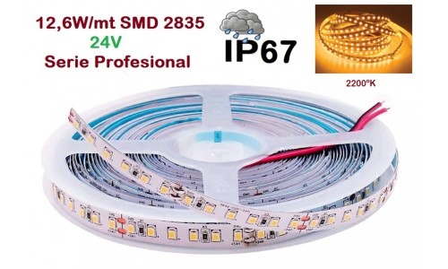 Tira LED Flexible 24V 12,6W/mt 120 Led/mt SMD 2835 IP67 2200ºK Serie Profesional, Venta por metros de 1 a 25mts a medida de su necesidad. Se suministra en tirada continua hasta 25mts TLF12283522P24IP67M. Tira LED flexibles serie Profesional son de máxima calidad (High Quality) y se presentan con configuraciones de distintas medidas y prestaciones. Modelos estándar o estancos con distintos tipos de leds SMD como unidad de luz principal, en tipo 3528 y 5050, 2835, 3014 y 5630. Su flexibilidad y la dotación de accesorios permiten su aplicación en multitud de diseños de iluminación decorativa de bajo consumo con un gran ahorro de energía El formato de nuestras tiras de LED, viene en rollos de LED de 5 metros pudiéndose cortar en múltiplos de 5 cm, de ese modo se consigue acoplarlo en cualquier proyecto a medida. Las tiras de LED autoadhesiva, y presente diferentes grados de protección. A la hora de utilizar esta tira de LED, hay que tener en cuenta su intensidad lumínica, por lo que tendremos que poner un objeto cercano en el que proyecte la luz. Si su fin es como señalización, (delimitar pasillo, resaltar zonas de paso,…) no es necesario buscar un objeto donde proyectar la luz.