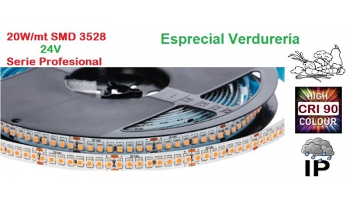 Tira LED 5 mts Flexible 24V 20W/mt 192 Led SMD 3528/mt IP65 Especial Vegetales, Serie Profesional IRC >90