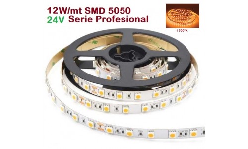Tira LED Flexible 24V 12W/mt 60 Led/mt SMD 5050 IP20 1700ºK Serie Profesional, Venta por metros de 1 a 50mts a medida de su necesidad. Se suministra en tirada continua hasta 50mts TLF12505017P24M. Tira LED flexibles serie Profesional son de máxima calidad (High Quality) y se presentan con configuraciones de distintas medidas y prestaciones. Modelos estándar o estancos con distintos tipos de leds SMD como unidad de luz principal, en tipo 3528 y 5050, 2835, 3014 y 5630. Su flexibilidad y la dotación de accesorios permiten su aplicación en multitud de diseños de iluminación decorativa de bajo consumo con un gran ahorro de energía El formato de nuestras tiras de LED, viene en rollos de LED de 5 metros pudiéndose cortar en múltiplos de 5 cm, de ese modo se consigue acoplarlo en cualquier proyecto a medida. Las tiras de LED autoadhesiva, y presente diferentes grados de protección. A la hora de utilizar esta tira de LED, hay que tener en cuenta su intensidad lumínica, por lo que tendremos que poner un objeto cercano en el que proyecte la luz. Si su fin es como señalización, (delimitar pasillo, resaltar zonas de paso,…) no es necesario buscar un objeto donde proyectar la luz.