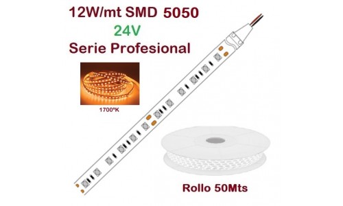 Tira LED Flexible 24V 12W/mt 60 Led/mt SMD 5050 IP20 1700ºK Serie Profesional, Rollo 50 mts TLF12505017P24R50. Tira LED flexibles serie Profesional son de máxima calidad (High Quality) y se presentan con configuraciones de distintas medidas y prestaciones. Modelos estándar o estancos con distintos tipos de leds SMD como unidad de luz principal, en tipo 3528 y 5050, 2835, 3014 y 5630. Su flexibilidad y la dotación de accesorios permiten su aplicación en multitud de diseños de iluminación decorativa de bajo consumo con un gran ahorro de energía El formato de nuestras tiras de LED, viene en rollos de LED de 5 metros pudiéndose cortar en múltiplos de 5 cm, de ese modo se consigue acoplarlo en cualquier proyecto a medida. Las tiras de LED autoadhesiva, y presente diferentes grados de protección. A la hora de utilizar esta tira de LED, hay que tener en cuenta su intensidad lumínica, por lo que tendremos que poner un objeto cercano en el que proyecte la luz. Si su fin es como señalización, (delimitar pasillo, resaltar zonas de paso,…) no es necesario buscar un objeto donde proyectar la luz.