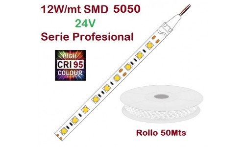 Tira LED Flexible 24V 12W/mt 60 Led/mt SMD 5050 IP20 Serie Profesional IRC >95, Rollo 50 mts TLF125050P24CRI95R50. Tira LED flexibles serie Profesional son de máxima calidad (High Quality) y se presentan con configuraciones de distintas medidas y prestaciones. Modelos estándar o estancos con distintos tipos de leds SMD como unidad de luz principal, en tipo 3528 y 5050, 2835, 3014 y 5630. Su flexibilidad y la dotación de accesorios permiten su aplicación en multitud de diseños de iluminación decorativa de bajo consumo con un gran ahorro de energía El formato de nuestras tiras de LED, viene en rollos de LED de 5 metros pudiéndose cortar en múltiplos de 5 cm, de ese modo se consigue acoplarlo en cualquier proyecto a medida. Las tiras de LED autoadhesiva, y presente diferentes grados de protección. A la hora de utilizar esta tira de LED, hay que tener en cuenta su intensidad lumínica, por lo que tendremos que poner un objeto cercano en el que proyecte la luz. Si su fin es como señalización, (delimitar pasillo, resaltar zonas de paso,…) no es necesario buscar un objeto donde proyectar la luz.